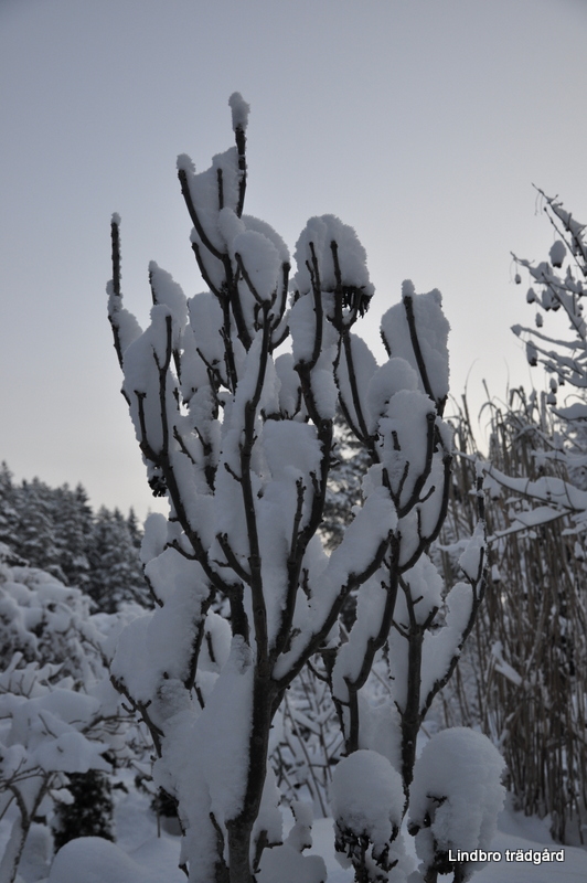 Hej. Nu har vintern kommit till Sköldinge, några cm snö och 4-5 grader kallt. Enligt prognosen kommer det att vara minusgrader i alla fall två veckor till. Nu när snön kommit, tänk på era små barrväxthäxkvastar, att om de har stam som är svag så kan de lägga sig. Stadga upp dem eller packa snö kring stammen så de står stadigt. ”Uppmuntran ger uthållighet” Hälsningar Lindbro trädgård
